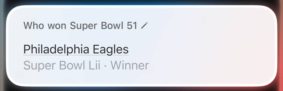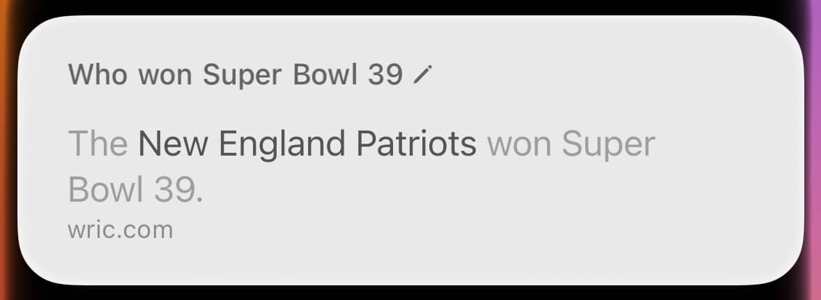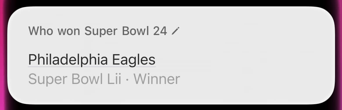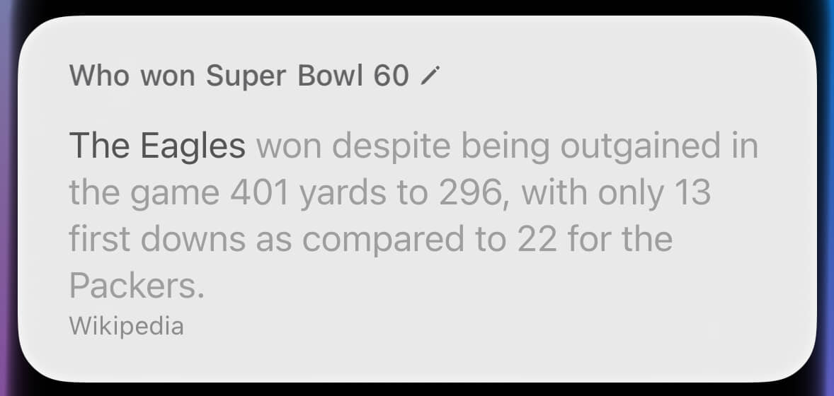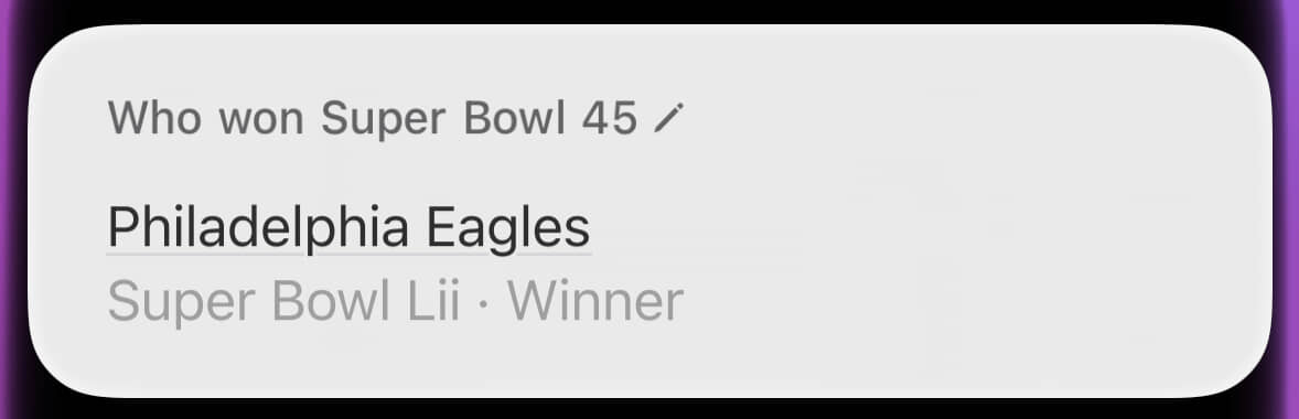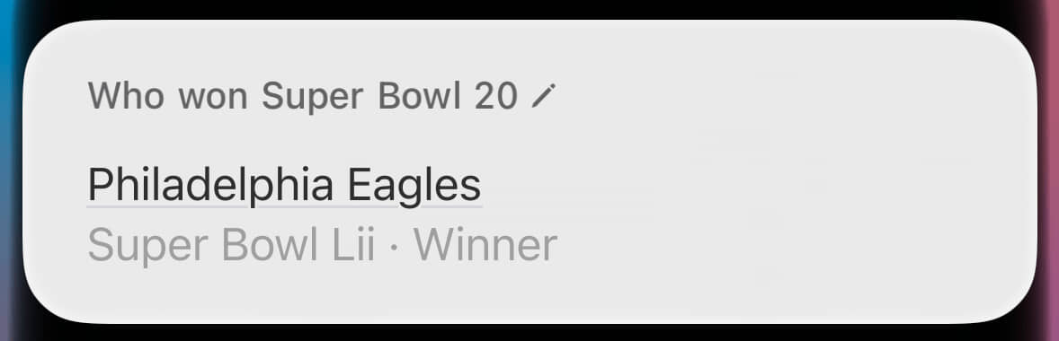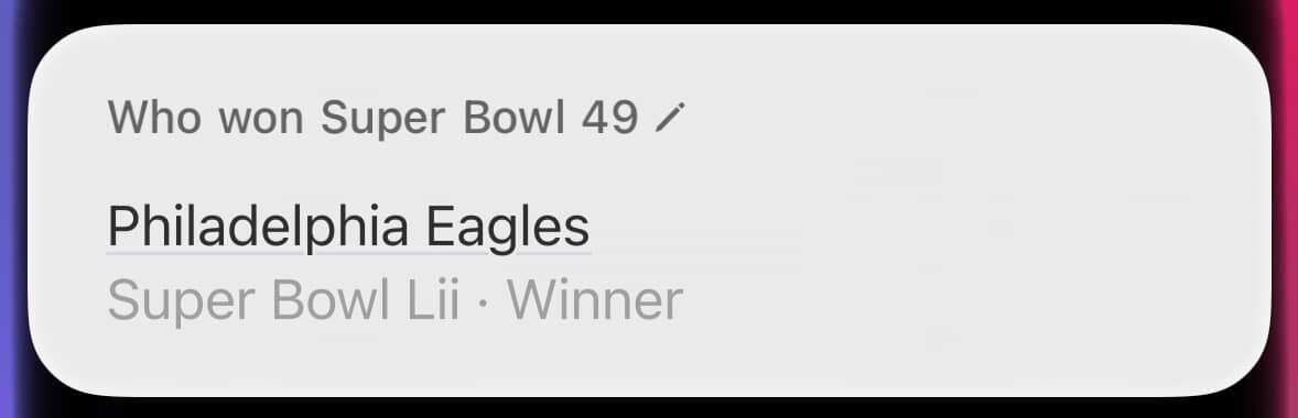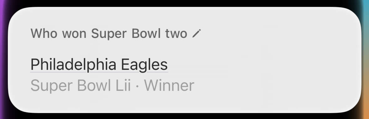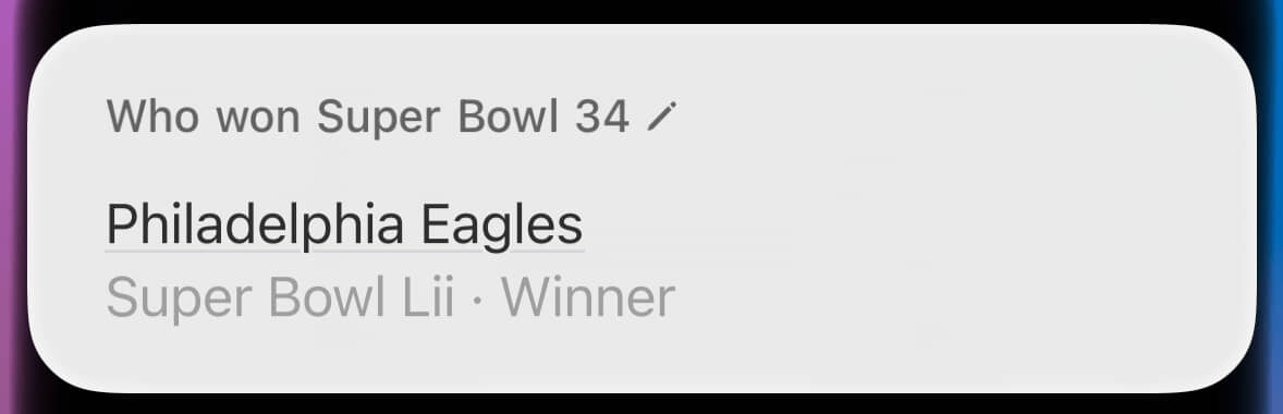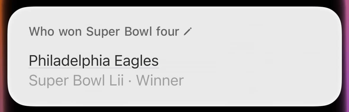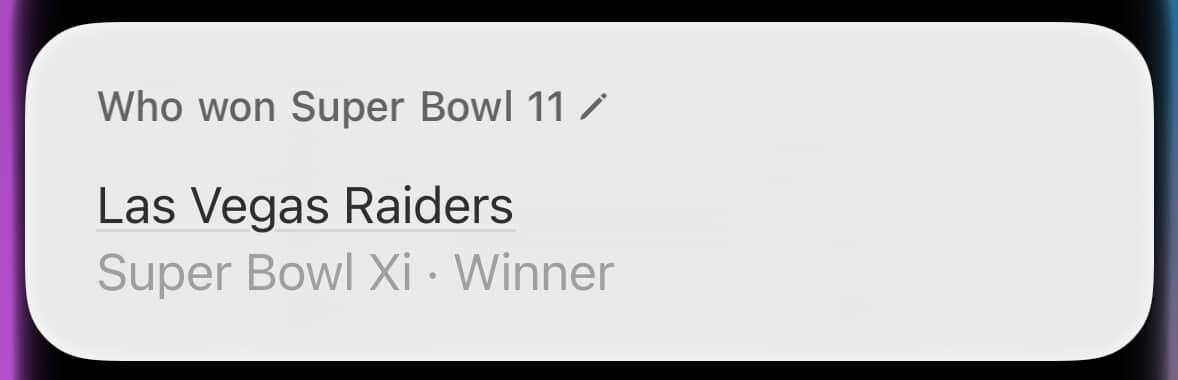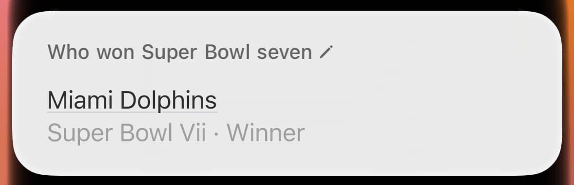 By contrast, look at that hideous wall of text about the wrong Super Bowl. This was where Siri provided the right answer for the wrong reason. Through sheer dumb luck, the winner of Super Bowl X (what I’d asked about) was also the winner of Super Bowl IX (what it’s blathering about).
