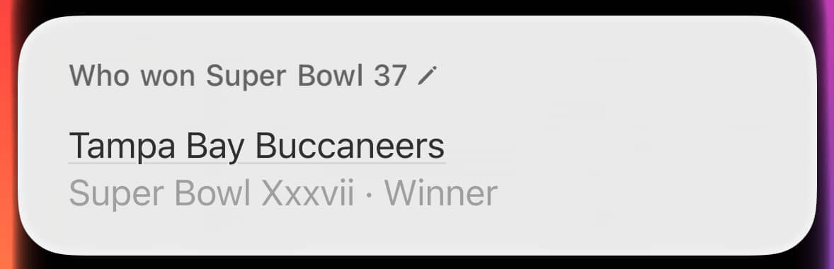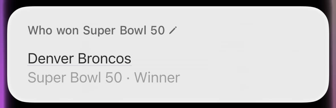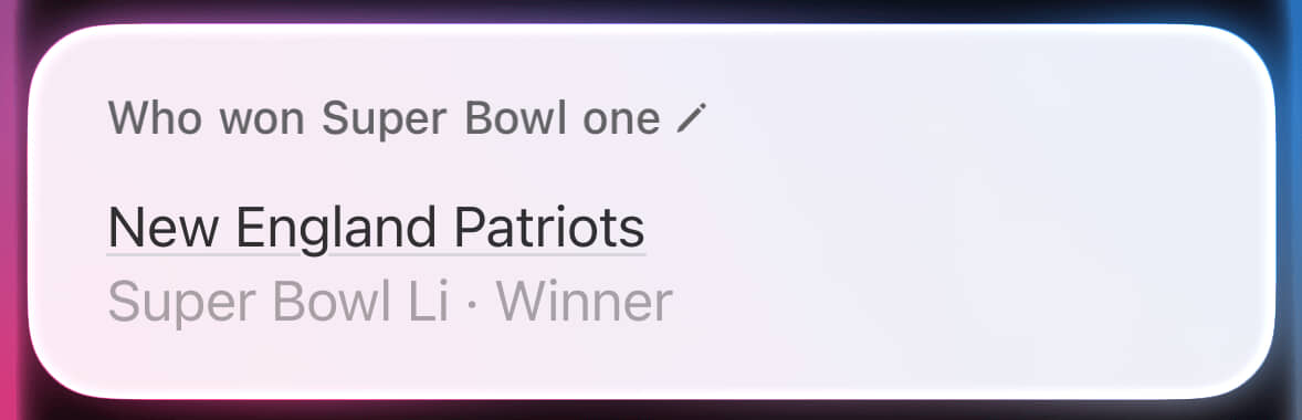 That’ll do it for today’s edition of “Siri Is Dreadful”. If you weren’t looking for an incredibly deep dive on Apple’s failings when it comes to providing answers about Super Bowl winners, well boy, how did you make it this far? As I did in my previous post, I will again wish you better luck tomorrow.