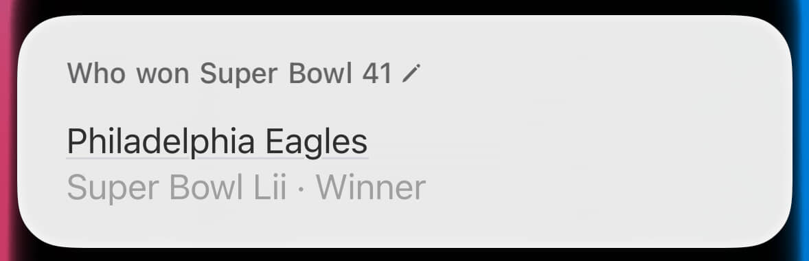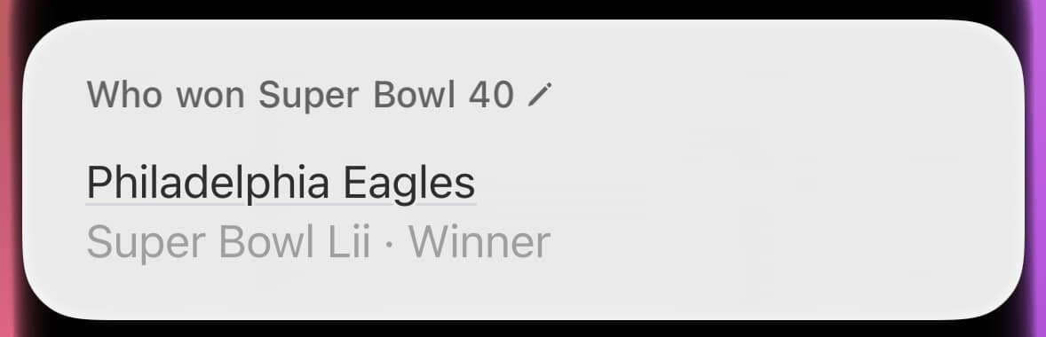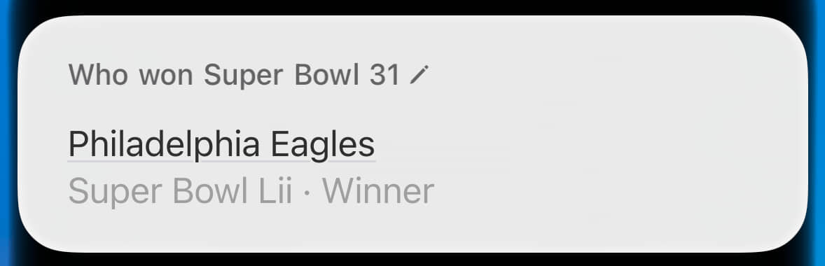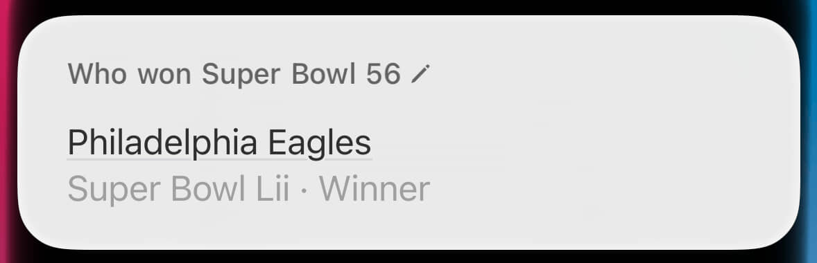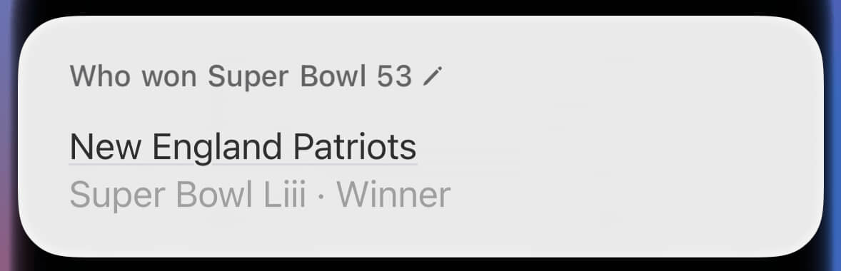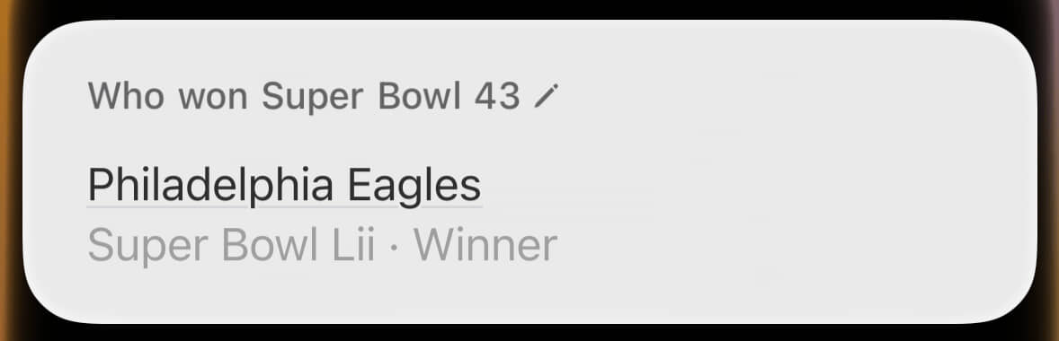 Super Bowl LIX (pronounced “licks”) hasn’t happened yet, and Siri knows it. Now we’re cooking with gas!
