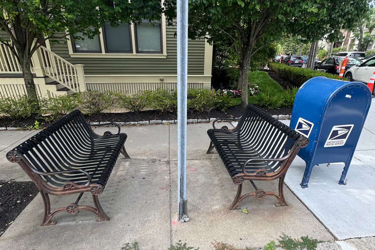All of this leads me to a new theory of events. The city recently dug up and replaced the sidewalk at this corner, and when they did, they must have moved that collection box. It seems it was placed between the benches for some number of days or weeks, which was certainly fairly dumb, but at least it was only temporary.